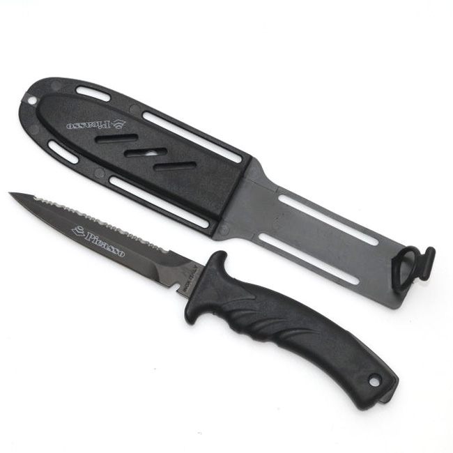 Нож NEW DEADLY.11,5 см нержавеющее лезвие имеет вырез для облегчения вытаскивания гарпуна из щелей. На спинке лезвия серрейтарная (пилка) заточка. Анатомическая рукоятка из резины, общая длина ножа 23,5 см.