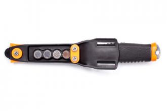 Уникальный нож с магнитным креплением в ножнах. Лезвие изготовлено из высококачественной европейской стали 440С - аналог 95Х18. Твердость клинка 54 HRC +/- 2 HRC
