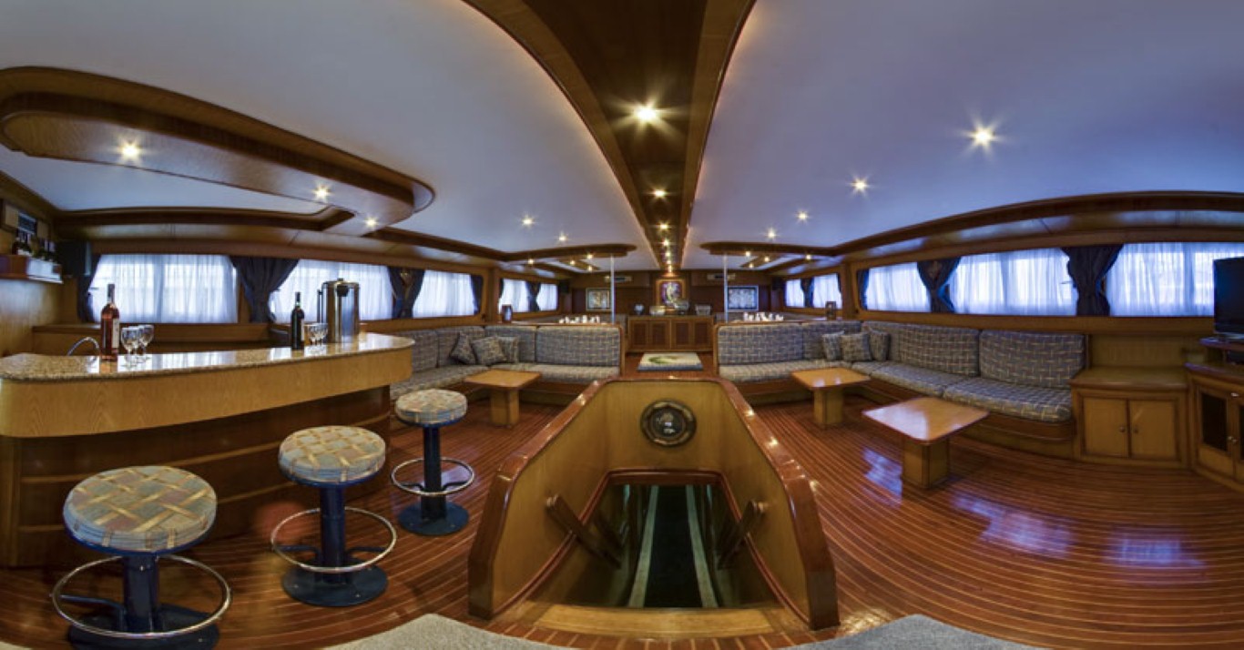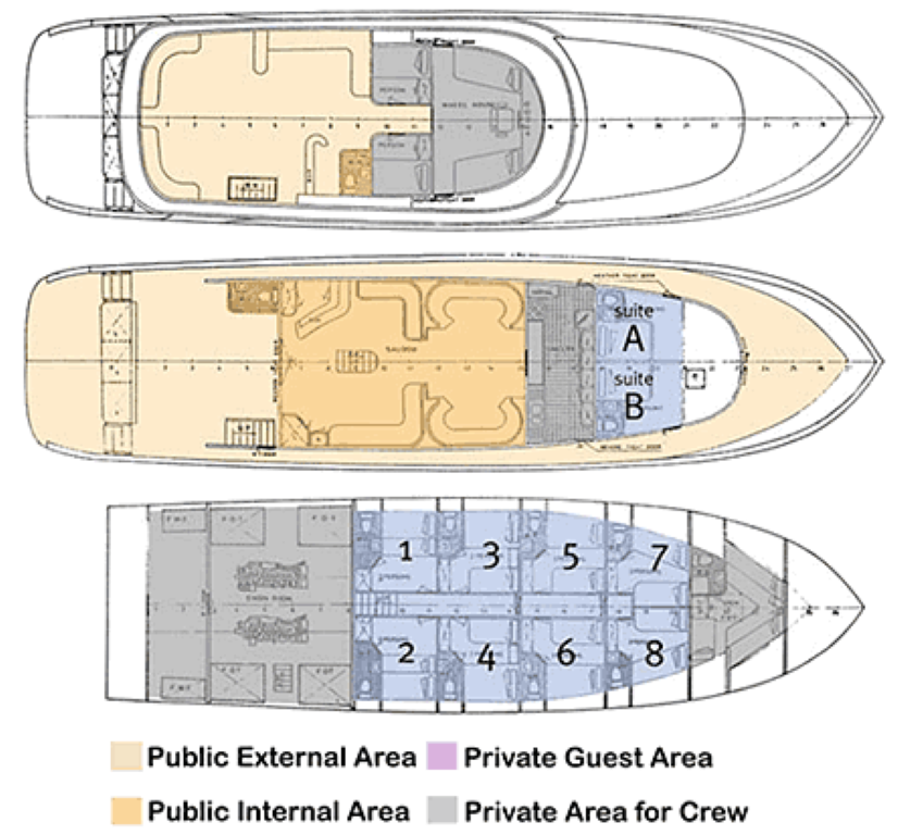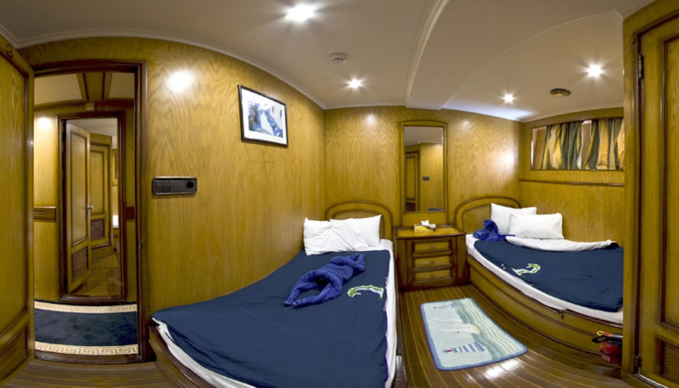 На яхте 11 двухместных кают. 8 кают класса standart с односпальными кроватями. Три каюты класса suite с двуспальной кроватью — на средней и верхней палубах.