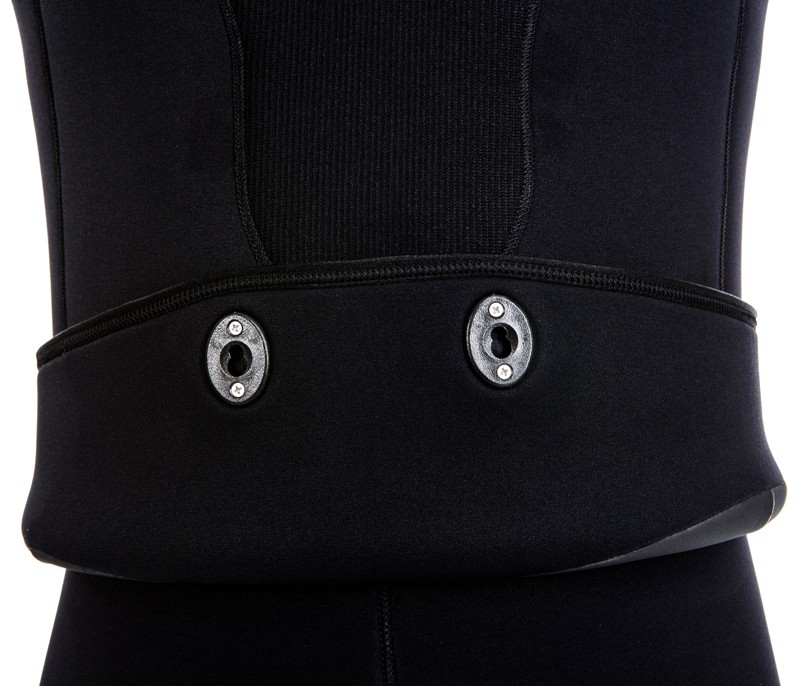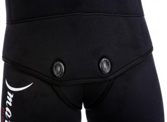 Вшитый в гидрокостюм упор для зарядки ружей, в отличии от приклееных аналогов, исключает отрывание его в процессе эксплуатации. Материал duratex (дюратекс) защищает колени и локти костюма от преждевременного истирания. Для исключения возможности повреждения гидрокостюма в процессе одевания и снятия, нижняя часть куртки изготавливается из двудублированого неопрена (нейлон\нейлон), тем самым увеличивая срок эксплуатации гидрокостюма.