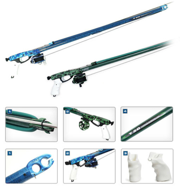 Особенностью серии подводных ружей T20 Carbon Med Mimetic является комплектация двумя видами рукоятей, стандартной и анатомической. Головная часть подводного ружья имеет дизайн, позволяющий использовать две кольцевые тяги диаметром 16 и 20 мм. Головная часть из-за своих малых размеров совершенно не закрывает силуэт рыбы и позволяет подводному охотнику производить наиболее точные выстрелы.
