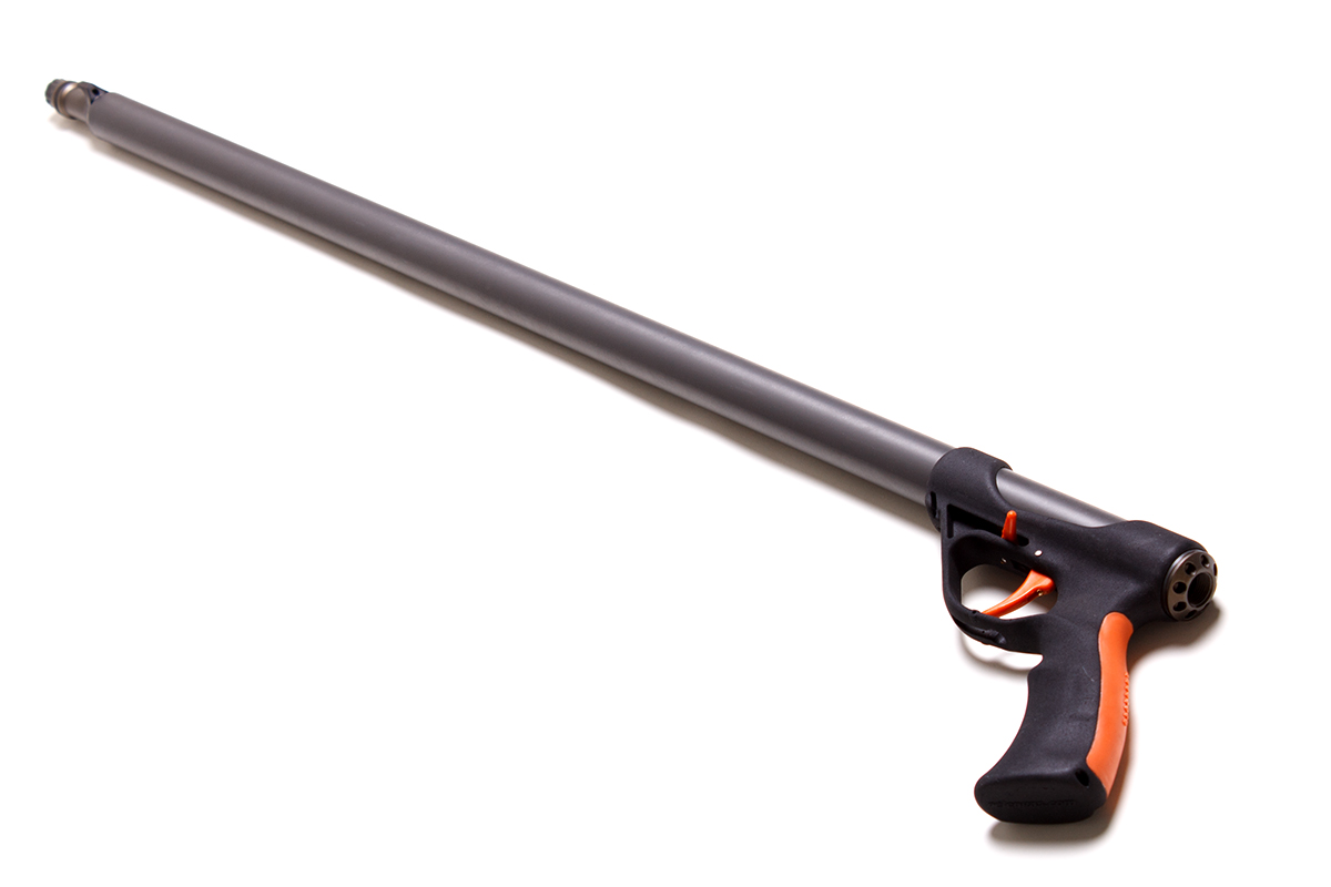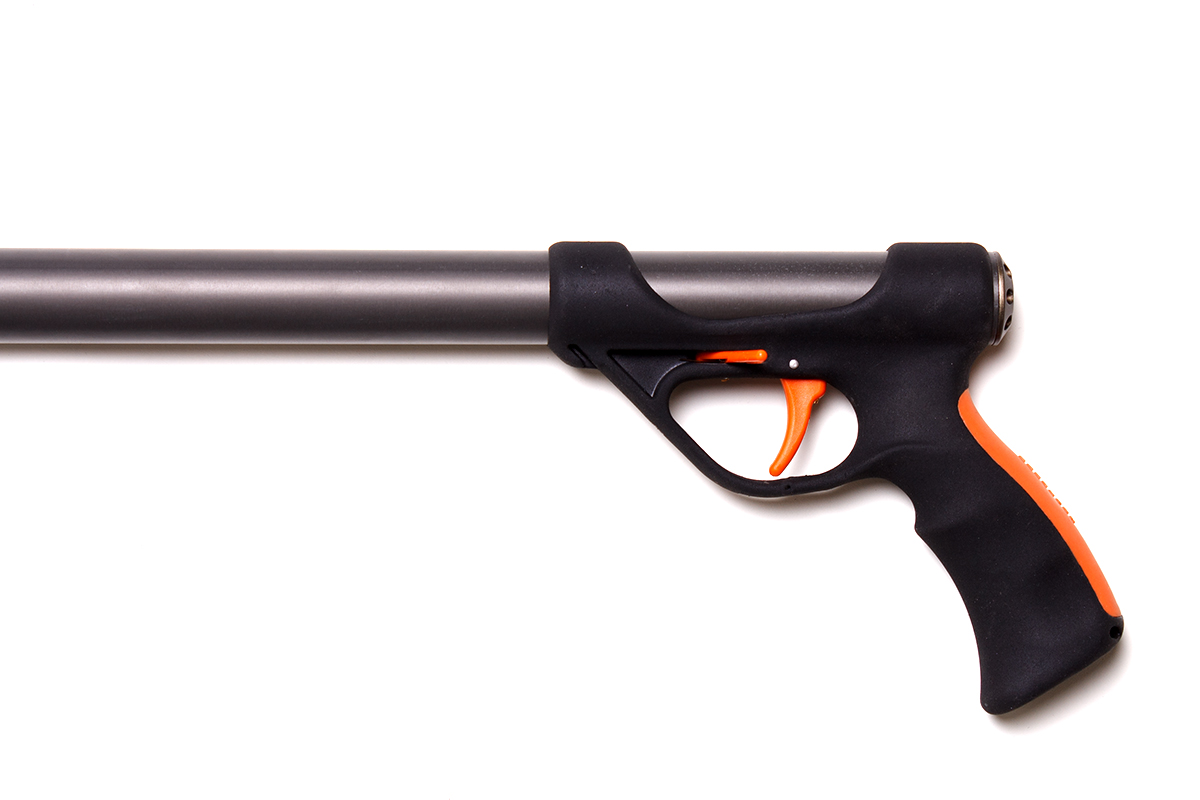 2. Удобная рукоять, с большим отверстием под указательный палец. Также на нее нанесено специальное покрытие от проскальзования с резиновой ярко-оранжевой накладкой с тыльной стороны, для удобства удержания. Внутри рукояти имеется герметичная полость, повышающая общую плавучесть ружья, а также предотвращающая эффект холодной рукояти. Отверстие в нижней части рукоятки для возможности крепления страховочного резинового кольца