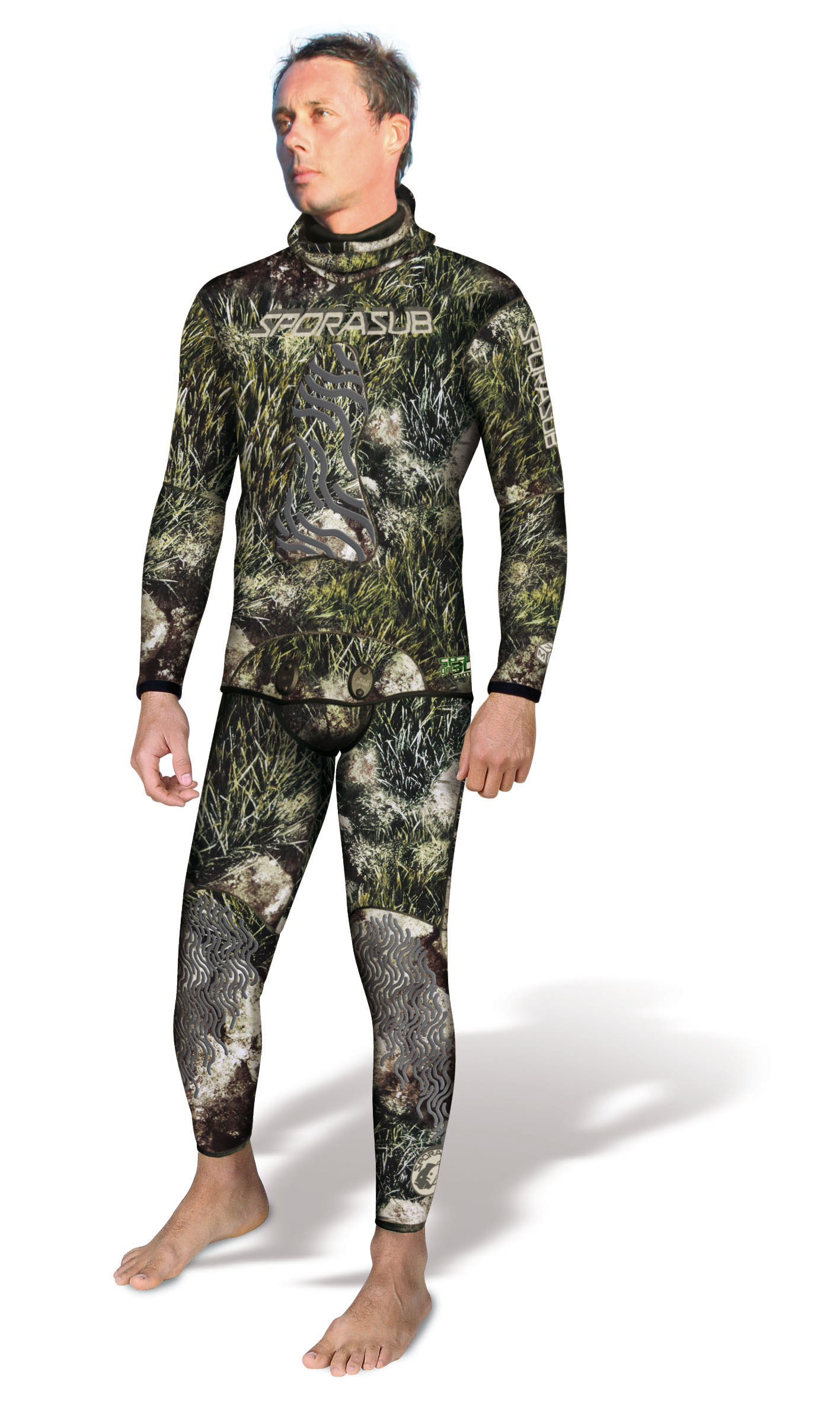 Новый гидрокостюм с открытой порой Sporasub Sea Green, 3 мм, покрытый снаружи нейлоном. При создании камуфляжа использовано трехмерное фотографическое изображение морского дна со всеми его особенностями, нанесенное на ткань костюма.